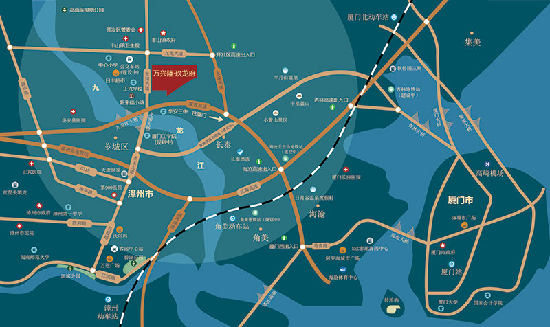 万兴隆·玖龙府项目位于厦门西、漳州北的华安经济开发区厦漳新城,正兴学校对面、龙翔大道东侧,项目与漳州市区一桥之隔,目前龙浦大桥主体已经建成,非机动车已经可以通过,预计下半年正式通车。项目距离龙浦大桥约500米,龙浦大桥开通之后可以连接到漳州市区的圣王大道、丹霞路,快速抵达沃尔玛商圈、碧湖片区、万达广场。项目距离高速入口仅3公里,轻松接驳多条通道快速抵达厦门岛内外,30来公里即达海沧、杏林。